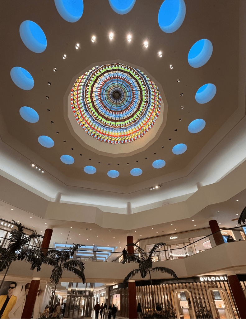 The first major expansion arrived in 1973, extending outward from the original Carousel Court to a new Jewel Court. It introduced a stained-glass dome designed by Marion Sampler, Gruen’s head graphics. The dome became an elevated feature that reinforced the idea that South Coast Plaza was an architectural experience.