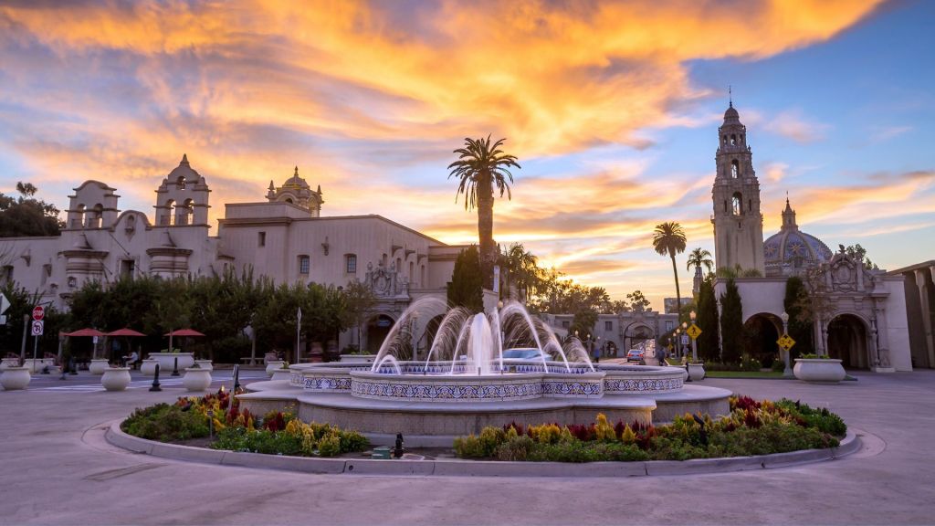 San Diego’s architectural heart–a lush cultural campus with intricate plasterwork, bell towers, colonnades, and tiled courtyards, with a touch of modernism.